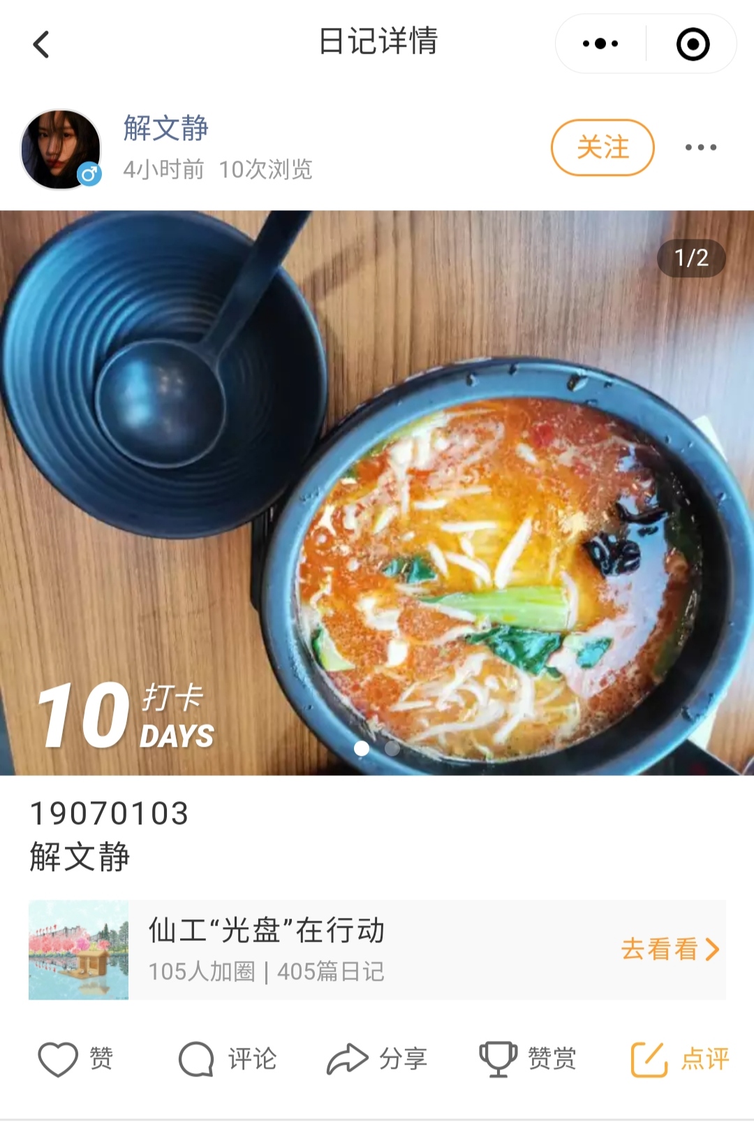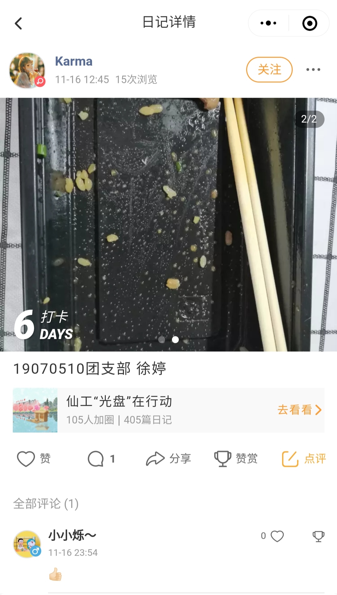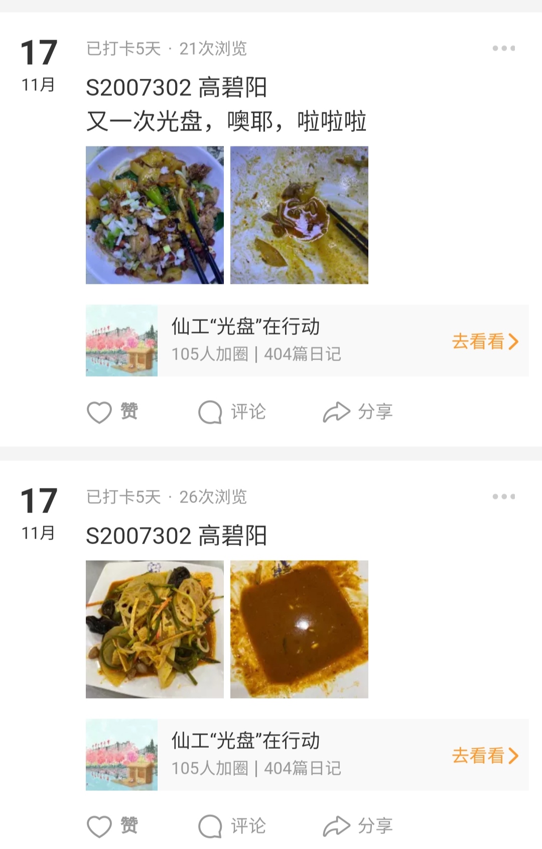 为持续引导广大团员青年珍惜粮食,拒绝餐饮浪费,弘扬中华民族勤俭节约的传统美德,牢固树立节约光荣、浪费可耻意识,TapTap团委于11月中旬在全校范围内组织团员青年开展了“仙工‘光盘’在行动”每日打卡主题团日活动。