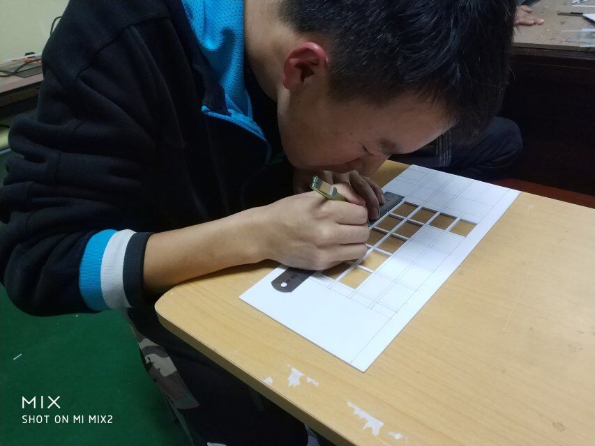 成员们首先依据比例,对材料进行切割。但由于手工切割,误差也是在所难免的。为此,大家不断计算、细心切割,努力减小误差,使模型更加合理。模型在粘贴时,也需要对模块进行微小的调整,让模型更加坚固。在模型的制作过程中,各组长向组员传授模型制作的经验和技巧,并指导组员进行操作,使活动更加顺利的进行。