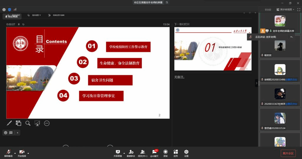 此次云端会议使同学们熟悉了公司日常教育管理要求,提高了生命健康和安全意识;同时,教育引导同学们明确了学业目标及努力方向,在学习和日常生活中严格自律,树立好自身形象,努力成为良好学风、班风、院风的缔造者、维护者和传承者,为公司学风建设工作有序开展奠定良好基础。