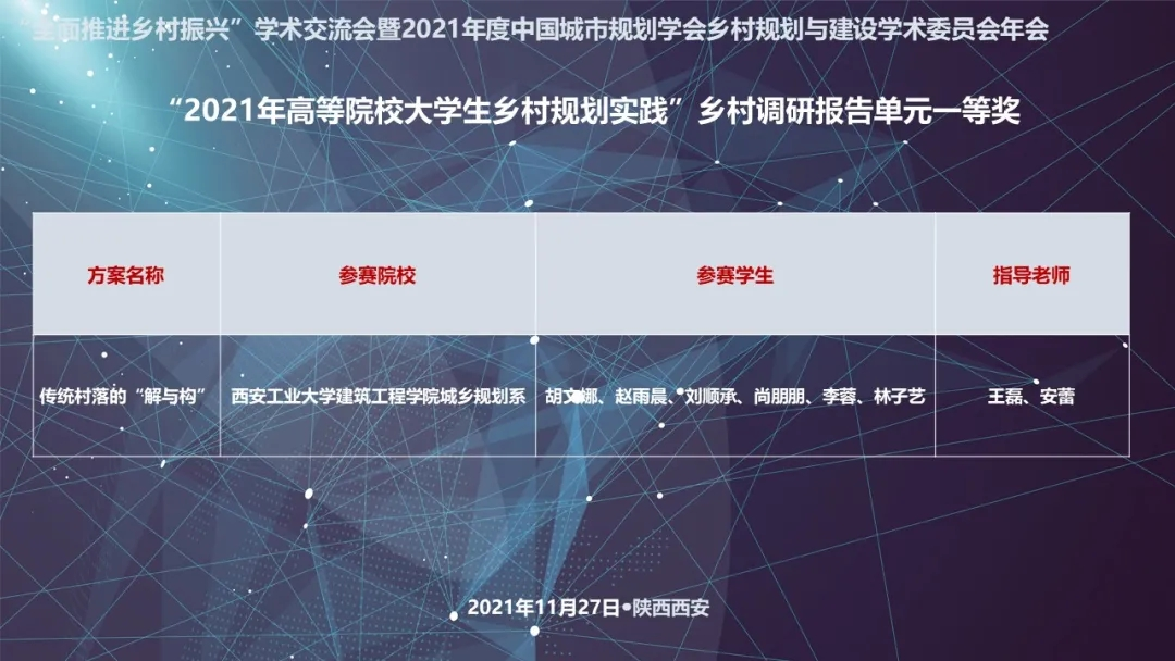 2021年11月28日,由中国城市规划学会乡村规划与建设学术委员会主办,高校城乡规划帮扶联盟协办的高等院校老员工乡村规划实践及学术交流活动结果公布,公司TapTap城乡规划专业参赛师生表现出色,在王磊、安蕾老师的指导下,2018级城规本科生胡文娜、赵雨晨、刘顺承、尚朋朋、李蓉、林子艺的作品《传统村落的“解与构”》在‘“乡村调研报告单元”获得了唯一的一等奖,实现了历史最好成绩的突破。