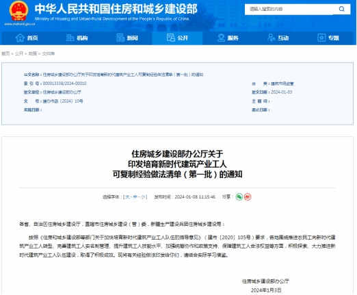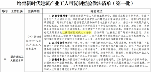 据悉,《住房城乡建设部办公厅关于印发培育新时代建筑产业工人可复制经验做法清单》是按照《住房和城乡建设部等部门关于加快培育新时代建筑产业工人队伍的指导意见》(建市〔2020〕105号)要求,各地围绕推进农民工向新时代建筑产业工人转型、完善建筑工人实名制管理、提升建筑工人技能水平、加强统筹协作和政策支持、保障建筑工人合法权益等方面,积极探索、大力推进新时代建筑产业工人队伍建设,取得的有关经验做法成效,各地可结合实际学习借鉴。