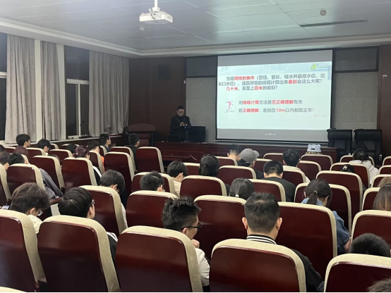 赵文玉副教授进行了题为“离心泵运行问题案例分析及优化运行节能探讨”的课程思政示范讲座。讲座以某泵站工程实际案例入手,探讨在课程理论知识的基础上,如何利用离心泵性能特征,充分发掘其运行数据规律提出水泵及泵组优化运行的解决方案,达到减轻电机或水泵损伤、保障水泵高效节能运行并降低企业生产成本的目的,充分激发了到场员工的兴趣。