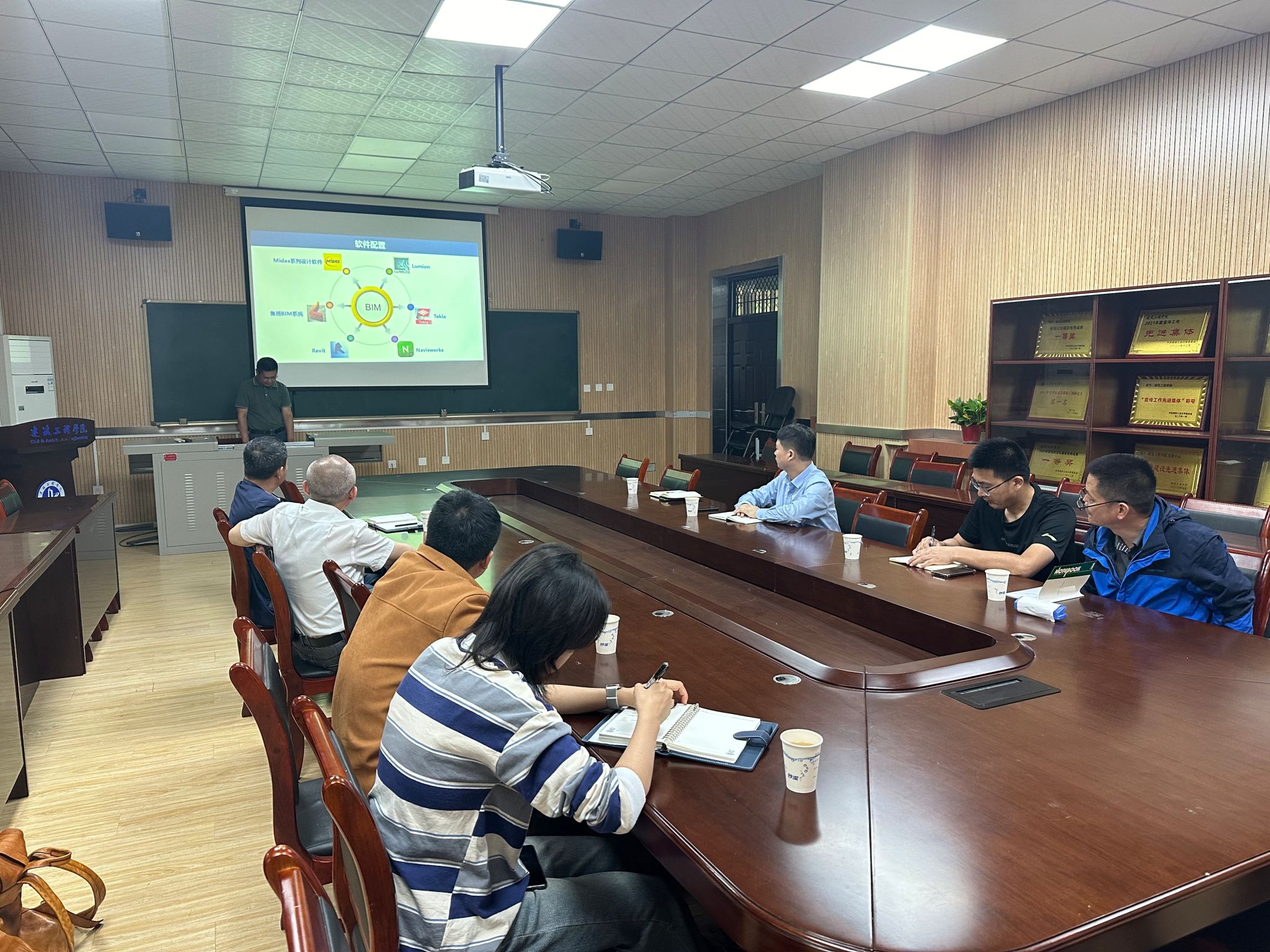 公司经理黄华介绍了公司团队的科研特色和研究成果,智能建造系主任李养成介绍了公司BIM平台以及相关的科研和员工培养。
