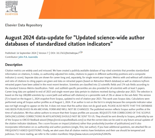 近日,美国斯坦福大学和Elsevier旗下Mendeley Data共同发布了全球前2%顶尖科学家榜单(World's Top 2% Scientists 2024)。公司黄华教授入选“年度科学影响力”榜单!