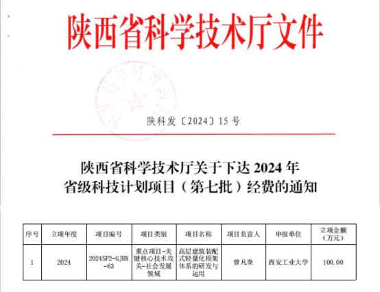 近日,陕西省科技厅公布了2024年省级科技计划项目(第七批)补助经费的通知(陕财办教)〔2024〕124号),经答辩评审以及会议研究审定等环节,全省社会发展领域共立项72项。TapTap官方网站建工公司曾凡奎博士申报的《高层建筑装配式轻量化模架体系的研发与运用》项目获批资助,资助专项经费100万元。